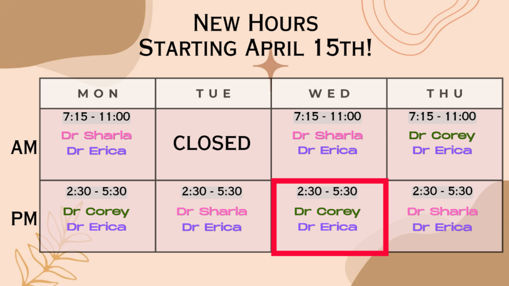 Starting April 15th, our new hours will be in effect and Dr. Corey will be adjusting on Monday and Wednesday afternoons along with Thursday mornings. Dr. Sharla will be adjusting Monday & Wednesday mornings and Tuesday & Thursday afternoons. Dr. Erica’s schedule will remain the same except for adding Wednesday afternoons.
